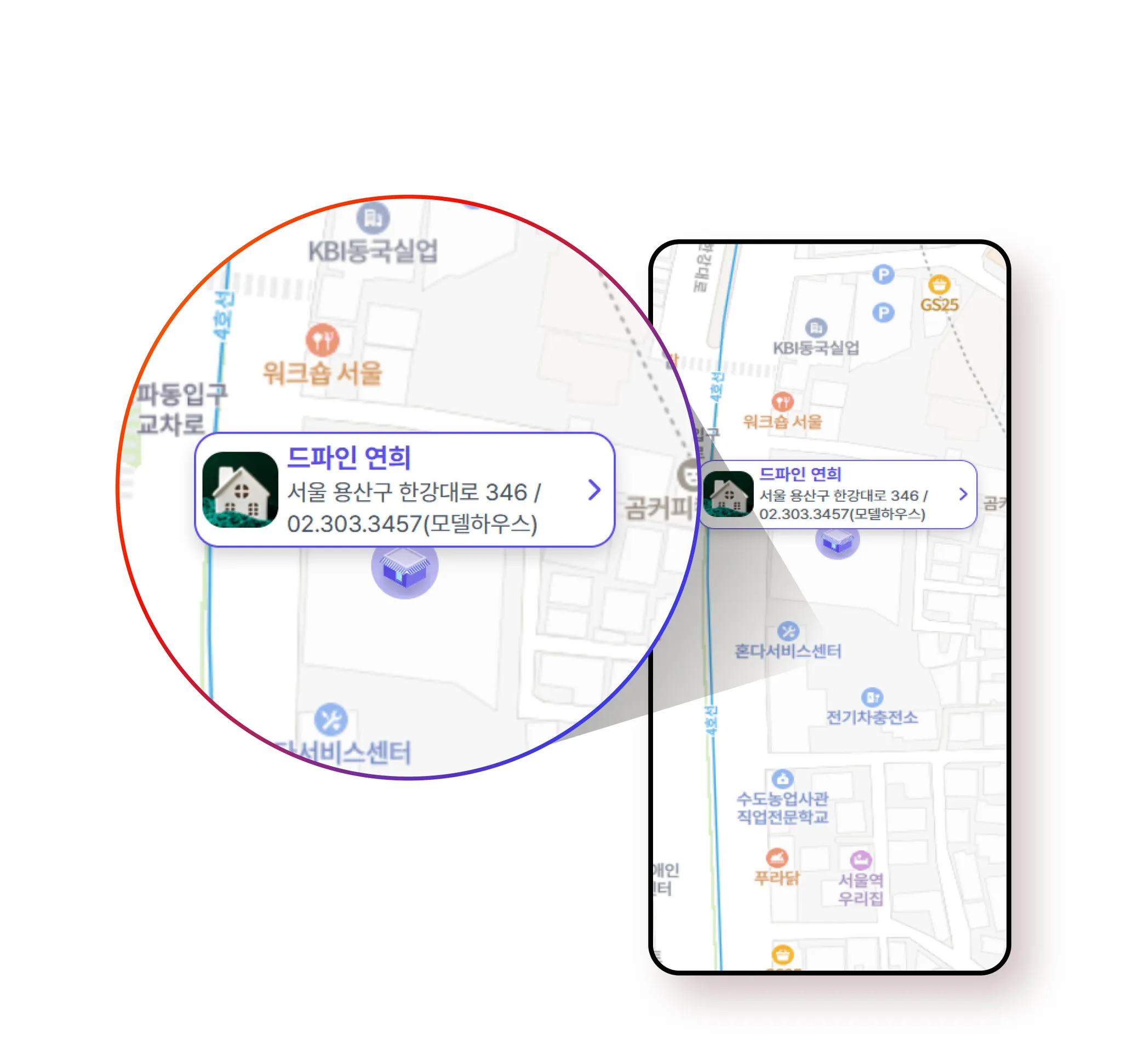 앱 실행 시 지도에서 주목도가 높은 프리미엄 마커로 광고가 노출됩니다.