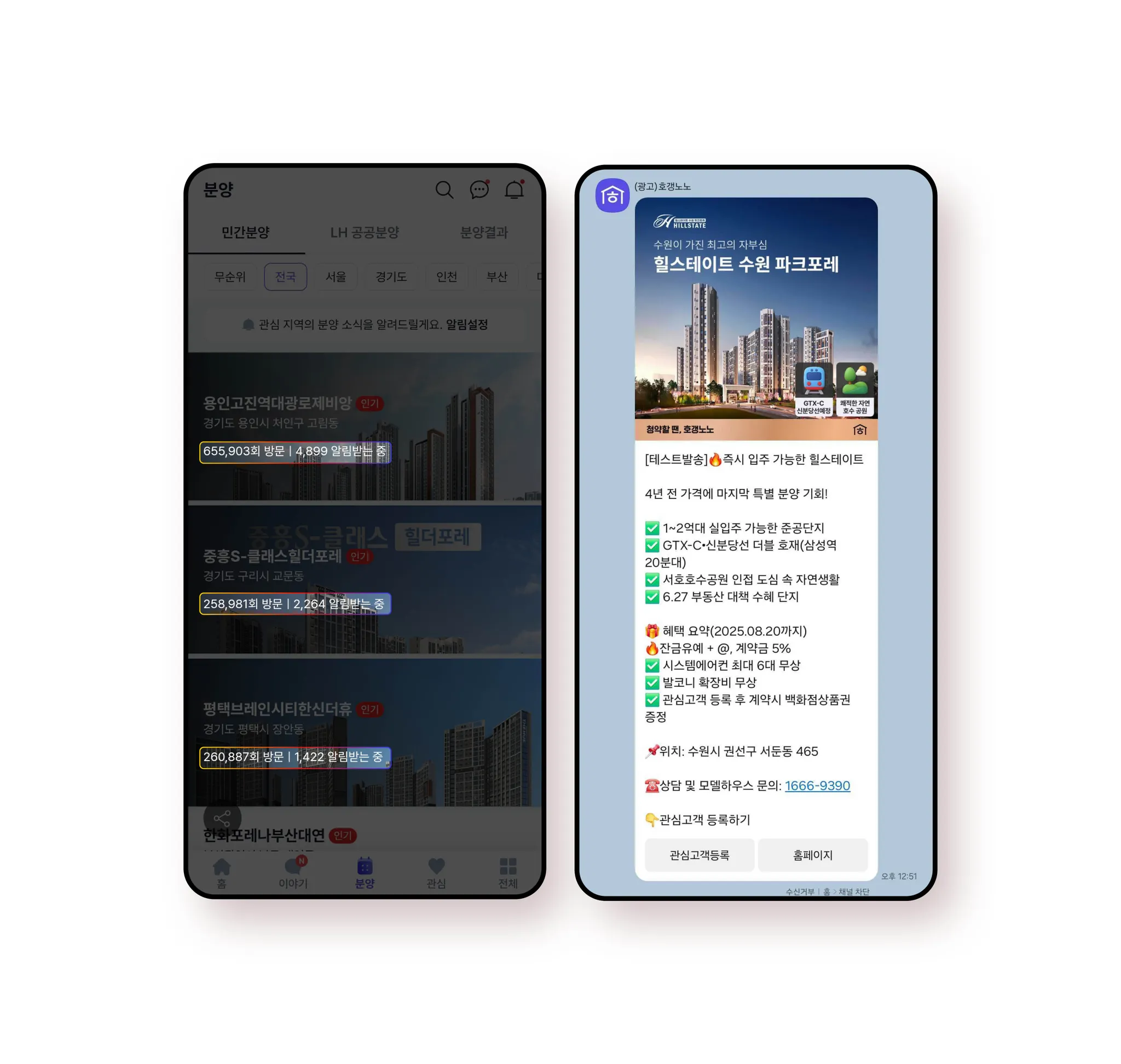 분양 탭 메인 페이지 상단 고정 노출을 통해 압도적인 주목도를 확보하고,