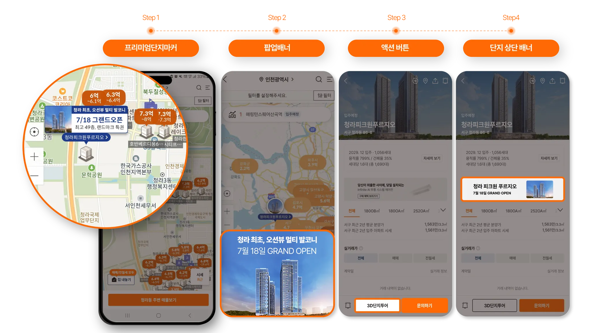 특징 | 기존 마커와 차별화된 프리미엄 단지 마커 다양한 분양 소식을 주목도 높게 노출 가능 |