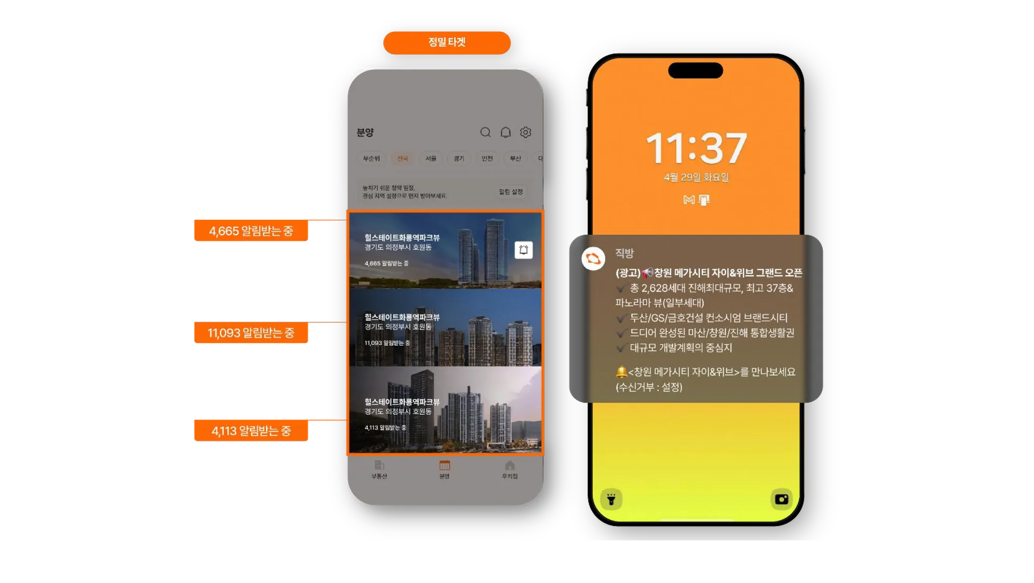 타겟 모수 | 분양단지 ‘알림받는 중’ 유저 정밀 타겟 |