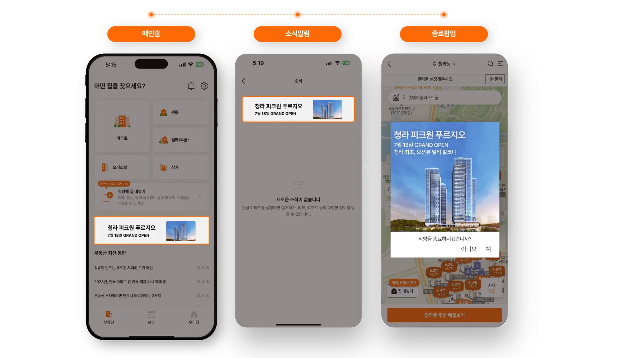 직방·호갱노노 앱은 현장 오픈 / 1순위 / 무순위 공지 등 주요 일정에 맞춰 관심 유저에게 앱 푸시로